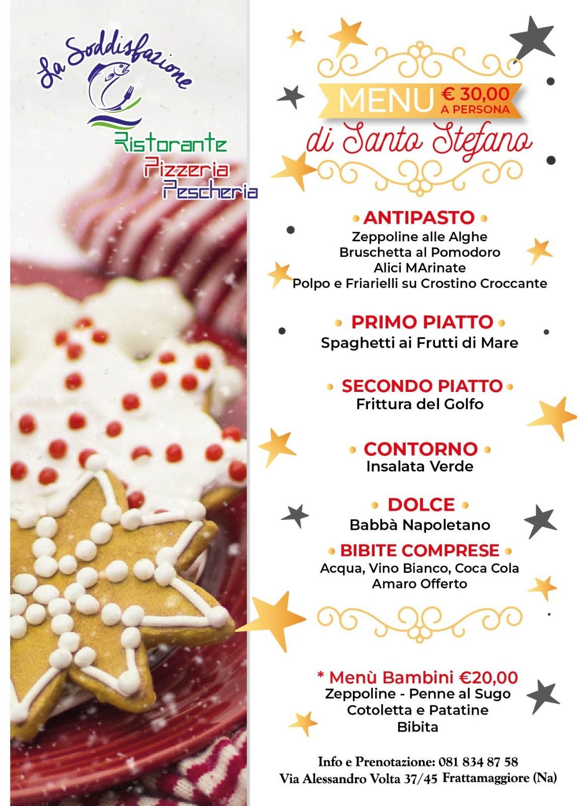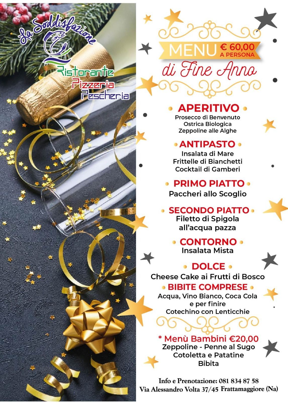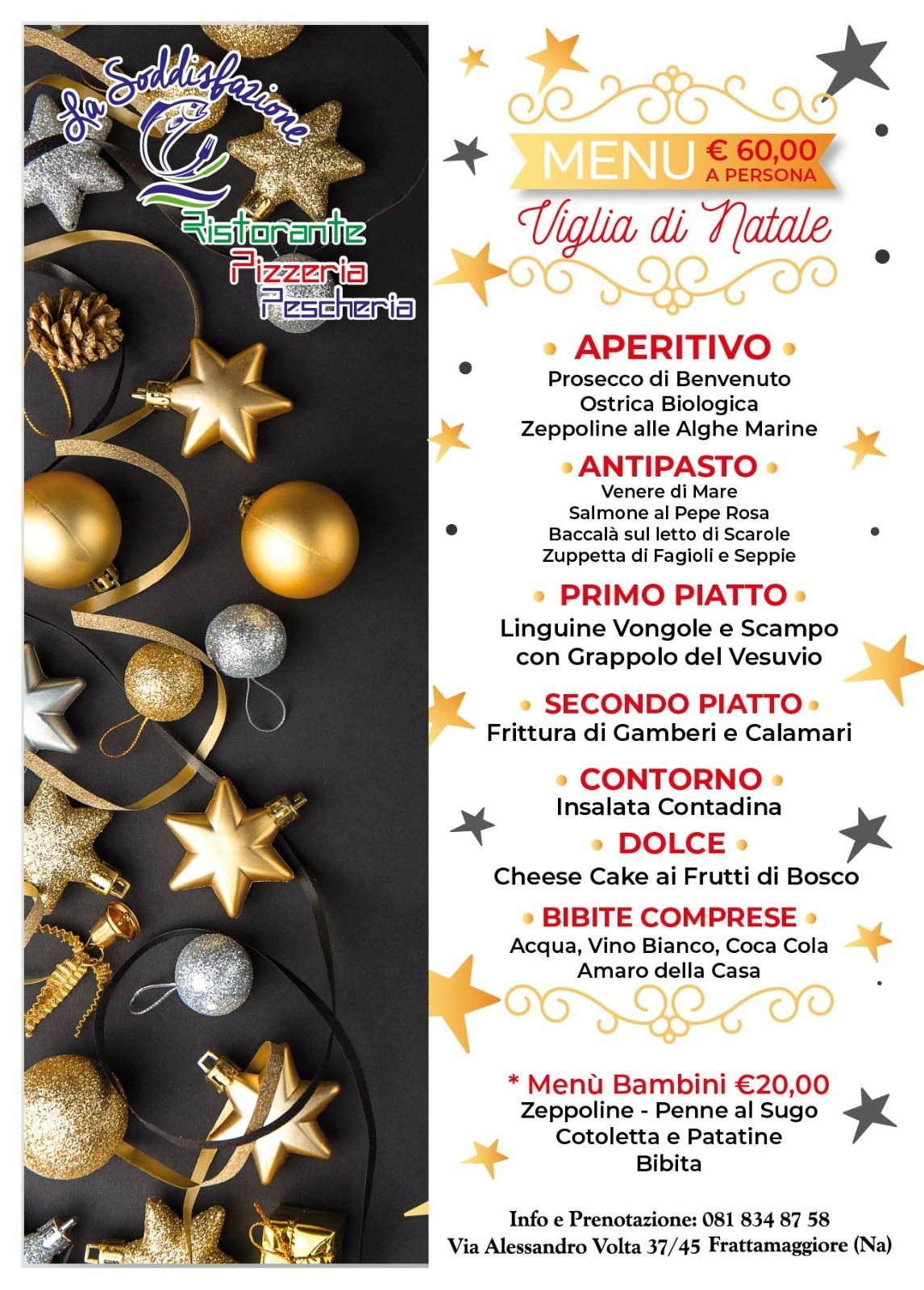 Il Ristorante Pizzeria Pescheria La Soddisfazione, in Via Alessandro Volta 37 a Frattamaggiore, in provincia di Napoli, è un ristorante con una peculiarità, che lo rende un’attrattiva per una clientela sempre maggiore ed esigente. Il ristorante, infatti, è anche una pescheria di pesce fresco, che propone tra le sue tante specialità crostacei e molluschi, nonché piatti tradizionali a base di pesce sempre fresco. Il titolare, dopo anni di successo per il lavoro di Chef, apre un ristorante vero e proprio, con cucina sia da asporto che servita ai tavoli. Un progetto ambizioso, progettato con amore e sapienza nel cuore di Frattamaggiore, grazie anche alla fiducia che i clienti della pescheria hanno accordato all’attività di ristorazione fin dai primissimi giorni. Con questa innovativa idea, il pesce, fresco di giornata, si può acquistare per essere cucinato a casa, oppure già preparato dal nostro chef, da asporto o ai tavoli. Il Ristorante offre anche menù tipici per i celiaci. VI aspettiamo nel nostro locale per farvi assaggiare il migliore pesce del Napoletano in un’atmosfera di cortesia ed attenzione verso il cliente, valori che ci contraddistinguono da sempre.